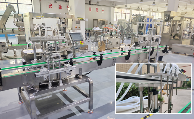 蠕動泵灌裝機由蠕動泵頭、電機驅(qū)動、橡膠管道等主要設(shè)備組成,采用伺服電機驅(qū)動,實現(xiàn)轉(zhuǎn)速精準(zhǔn)調(diào)節(jié),灌裝量依然能保持準(zhǔn)確,灌裝誤差僅在±0.5%之間,采用衛(wèi)生級硅膠或氟橡膠管,耐腐蝕、更換配件方便簡單。這種多頭自動灌裝小瓶水設(shè)備一次可以灌裝多個容器,有幾個灌裝頭就可以灌裝幾個容器,每個灌裝頭配備缺瓶止灌功能,避免空灌浪費,比如說四個灌裝頭,只有三個瓶子,那另外一個灌裝頭就不會出料,沒有感應(yīng)到容器的位置,所以說,不會浪費原料,也不會對設(shè)備造成影響。