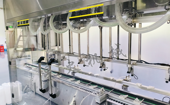 江蘇自動稱重灌裝機廠家針對這種液體的特點,對設備進行了一系列的升級改造,為了適應化工液體的生產環境,設備采用了防爆設計,SUS 304不銹鋼接觸面,耐腐蝕,耐酸堿,適合化工行業的生產環境。25公斤液體阻垢劑稱重灌裝旋蓋整線解決方案分為兩個部分:一個是灌裝部分,采用的是6頭大型液體稱重灌裝機,灌裝范圍可從5-25kg調整,下潛式灌裝,灌裝頭下降到容器之中開始灌裝,避免了高速灌裝流量的沖擊,自動調整灌裝速度,自動除皮,稱重傳感器精度高,每小時可灌200-350桶,完全能滿足產線需求。另一個是旋蓋部分,振動盤自動理蓋落蓋,適配25公斤桶的螺紋蓋,扭矩可調(5-20N·m),防止過緊導致蓋子變形或過松引發泄漏。