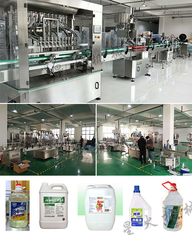 星火消毒水自動灌裝設備廠房展示全自動消毒水灌裝機及灌裝樣品