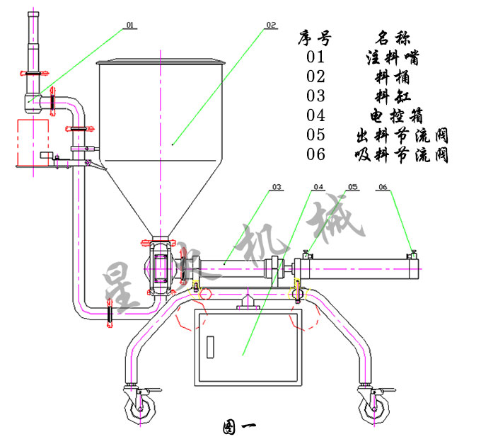 2.安裝注料嘴01(圖一),將大方體端口和灌裝頭端口用進(jìn)料管相連,并以卡箍`鎖緊。