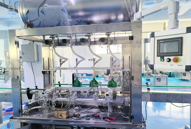 這款4頭液體稱重灌裝機是用來灌裝1-5L液體的設備,和傳統的灌裝設備有所不同的是,它采用自動稱重灌裝方式,是一種現代化的全自動消毒液灌裝機,包括供料系統、稱重系統、控制系統等,實現全自動進桶、計數、灌裝、出桶過程,支持液面上/液面下灌裝方式,并配備防滴漏裝置,防止液體滴漏。該設備適用范圍廣,靈活性強,能滿足不同產品及不同規格的液體物料灌裝。