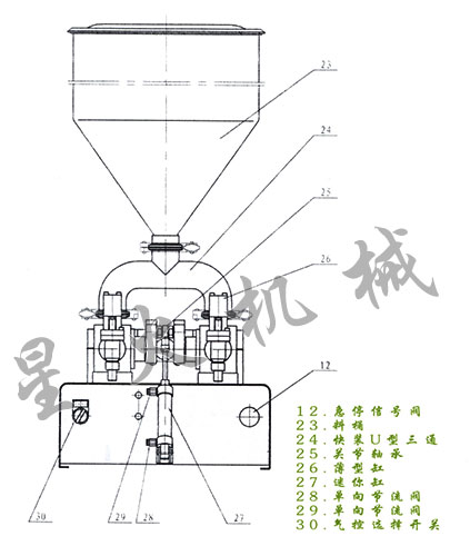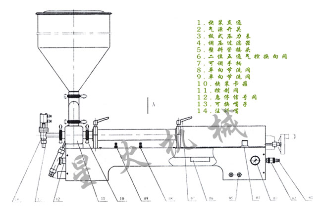 工作原理:粘稠膏體灌裝機是本公司開發(fā)的DY半自動活塞式灌裝系列的一種對高濃度流體進行灌裝的設備。它是通過氣缸同時帶動兩個活塞以及轉閥的三通原理來抽取和打出高濃度物料,并以信號閥控制氣缸的行程,通過15手輪(結構俯視示意圖圖二)調節(jié)灌裝量。由于本設備采用雙頭同時灌裝,大大提高了工作效率,是中小企業(yè)的理想選擇。