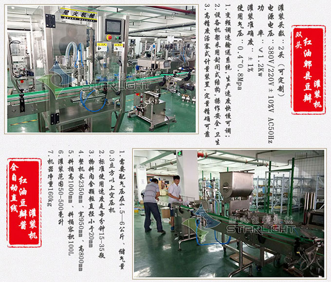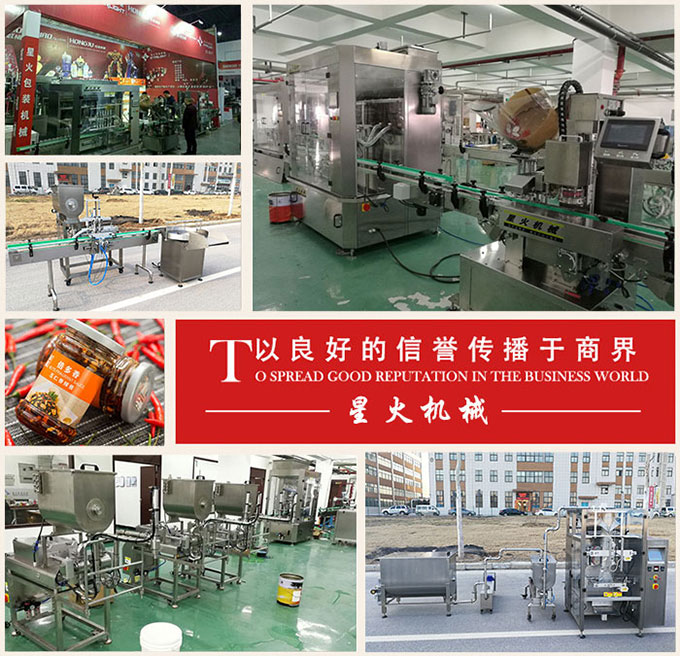 辣椒醬灌裝機系列設備。星火辣椒醬灌裝機系列設備適用于紅油豆瓣醬、郫縣豆瓣、辣椒醬、牛肉醬等產品,產品做工精細、結構考究,獲得客戶一致好評,曾先后服務過海底撈、李錦記、六必居、重慶仔、辣妹子、仲景香菇醬、老干爹等多家知名醬類企業。