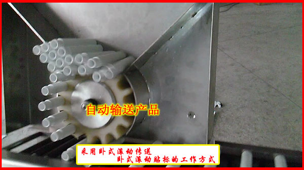 工作流程:人工把產品統一方向送至送料器----送料器自動輸送產品進入輥筒鏈條輸送帶上----電眼檢測貼標工作-----產品旋轉貼標加固-----成品輸出。