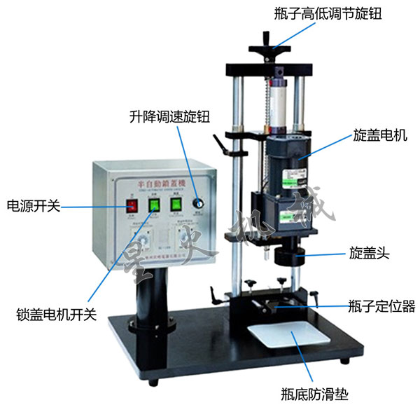 臺式旋蓋機由旋蓋機、旋蓋頭、多檔變壓器三部分組成,便于隨身攜帶。工作時,旋蓋頭罩在瓶蓋上方,旋蓋頭與旋蓋機相連,按動開關,旋蓋頭旋轉,稍向下用力,0.3-0.5秒鐘即可將瓶蓋旋緊。若把機器配上自動輸送裝置,該旋蓋機即可實現(xiàn)流水作業(yè)。