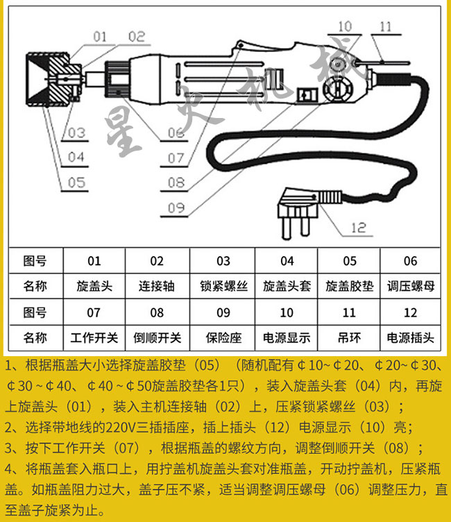 電動手持旋蓋機組成結構說明設計圖: